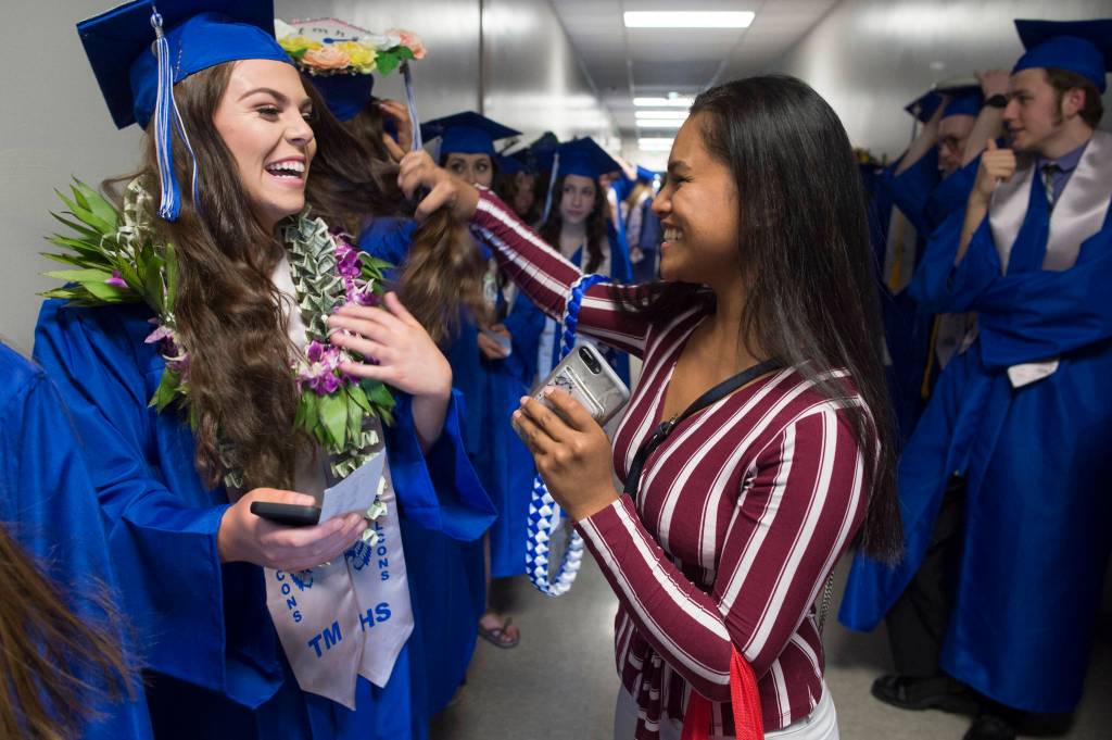 Heilala Toetuu, right, delivers a lay to senior Anna Parise before the Thunder Mountain High School graduation on Sunday, May 26, 2019. (Michael Penn | Juneau Empire)