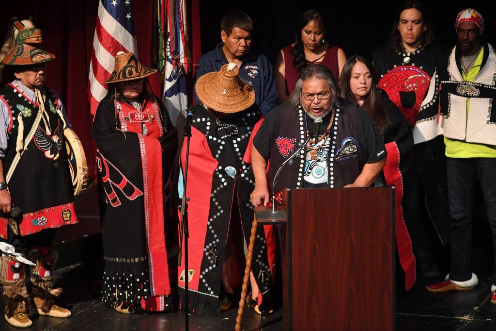 Representatives from the Village of Kake offer their respect during a memorial for the Guardian Flight crew at Juneau-Douglas High School: Yadaa.at Kalé on Friday, June 7, 2019. (Michael Penn | Juneau Empire)