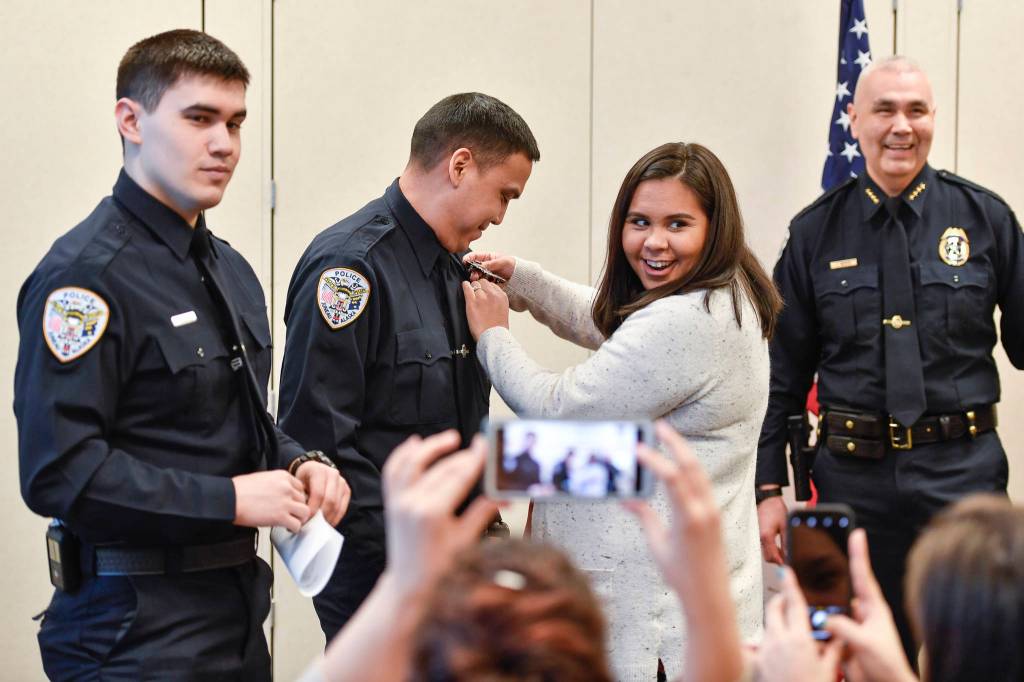 Amber White laughs as she pins a badge on her husband, Duain White, of Juneau, center, during a ceremony for new officers at the Juneau Police Department station on Thursday, Feb. 21, 2019. Chief of Police Ed Mercer,right, sworn in White and Jonah Hennings-Booth, of Eagle River, left. (Michael Penn | Juneau Empire File)
