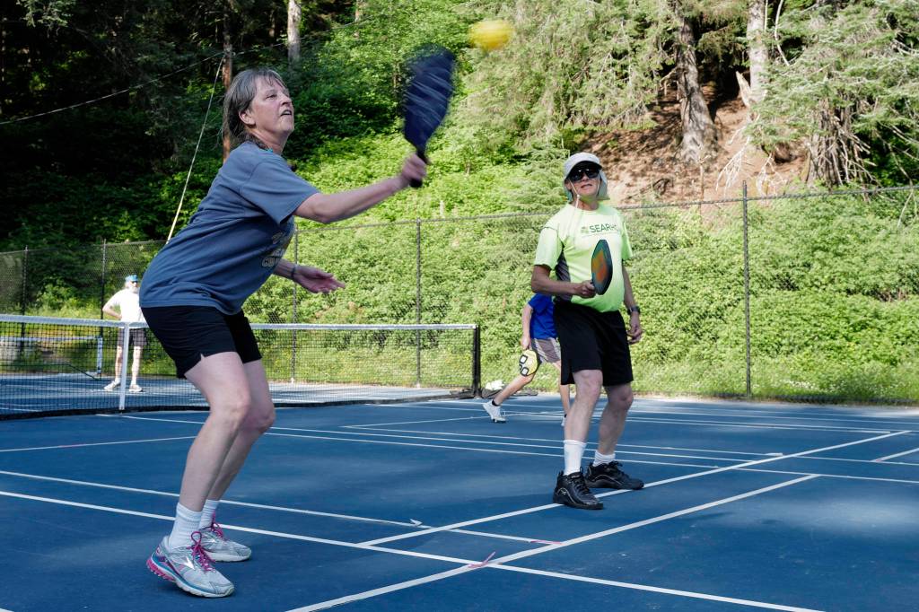 Since their opening last year, Cope Park’s tennis courts have become the home base of Juneau’s burgeoning pickleball community. The group meets every rain-free Monday, Wednesday and Friday during the summer on the blue courts, assembling anywhere between one to three nets depending on the turnout. By 5:30 p.m. on this particularly Wednesday, over 15 players have arrived, some coming straight from work.