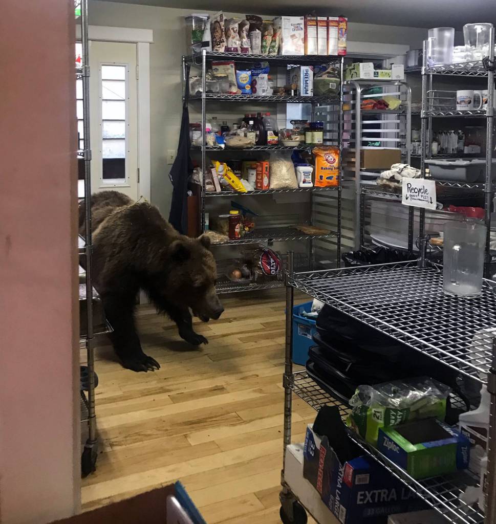 As guests were gathered in the dining room, a young brown bear decided the Highliner Lodge’s kitchen would be a good place to find something to eat.