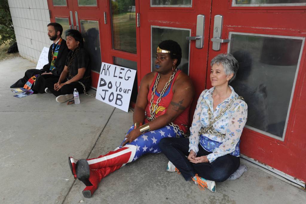 “We decided to take over the chairs of the legislators,” Beagnyam said, referring to the desks. Protesters urged the legislators in Wasilla to “return to Juneau, to do their jobs,” and that “it’s not okay to have a PFD at the cost of people dying,” Beagnyam said, noting the cuts to social services that would occur if Gov. Mike Dunleavy’s vetoes are allowed to stand.