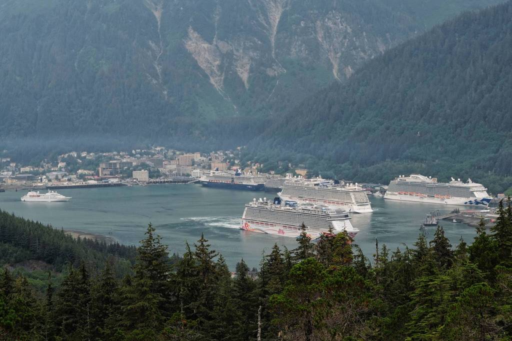 Six of the seven cruise ships due in Juneau on Tuesday, July 9, 2019, sit in the downtown harbor. The seven ships have the potential of bringing over 22,000 visitors to Juneau for the day. (Michael Penn | Juneau Empire)