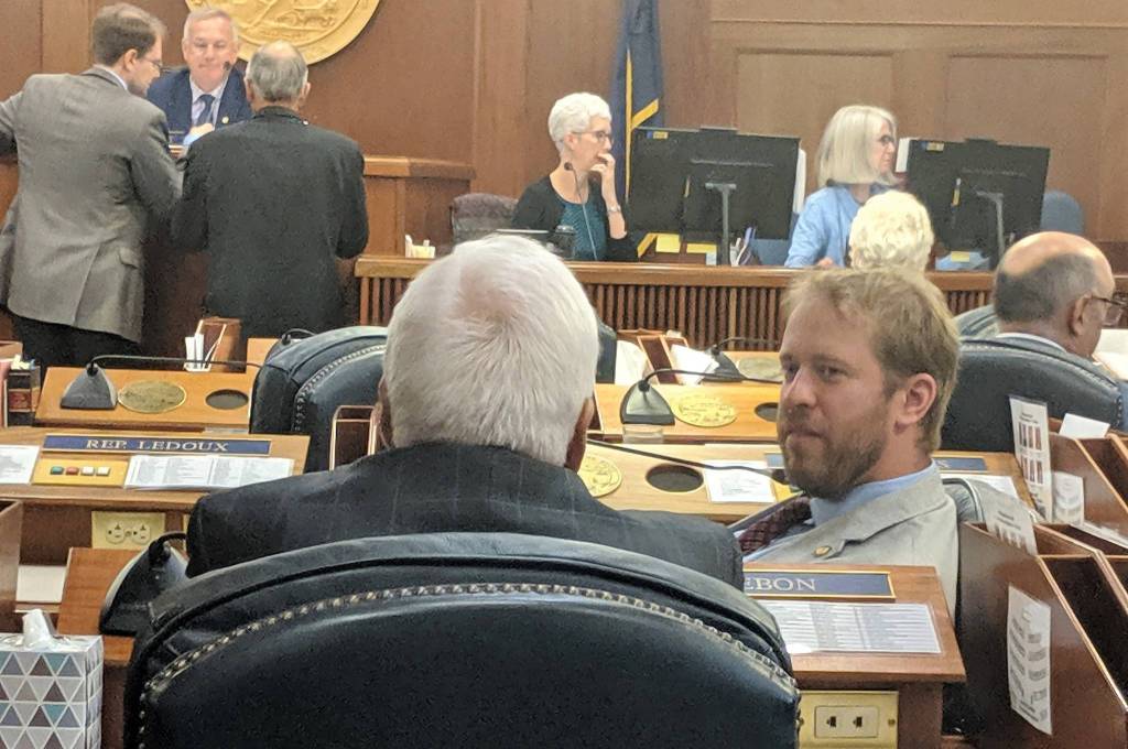 Rep. Grier Hopkins, D-Fairbanks, talks with Rep.Bart LeBon, R-Fairbanks, while other legislators mingle during an at ease during the House floor session Sunday, July 21, 2019. (Ben Hohenstatt | Juneau Empire)