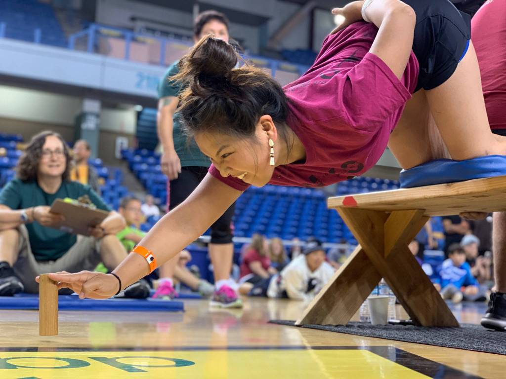 Coach Kaytlynne Lewis competes in the bench reach at the World-Eskimo Indian Olympics at the Carlson Center in Fairbanks on Saturday, July 20, 2019. (Greg Lincoln | For the Juneau Empire)