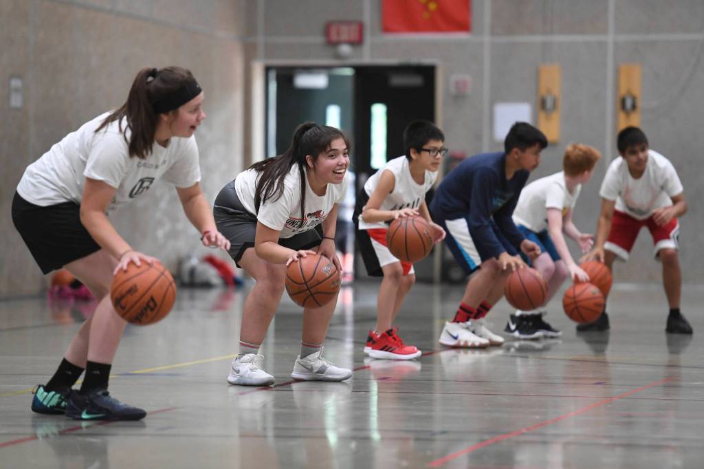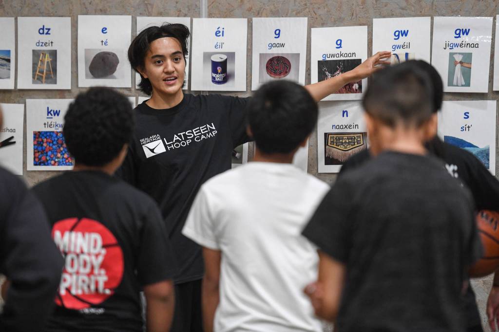 Youth from 6th to 12th grade participate in the weeklong Latseen Hoop Camp that mixes Tlingit culture and language with basketball at Dzantak’i Heeni Middle School on Monday, July 29, 2019.