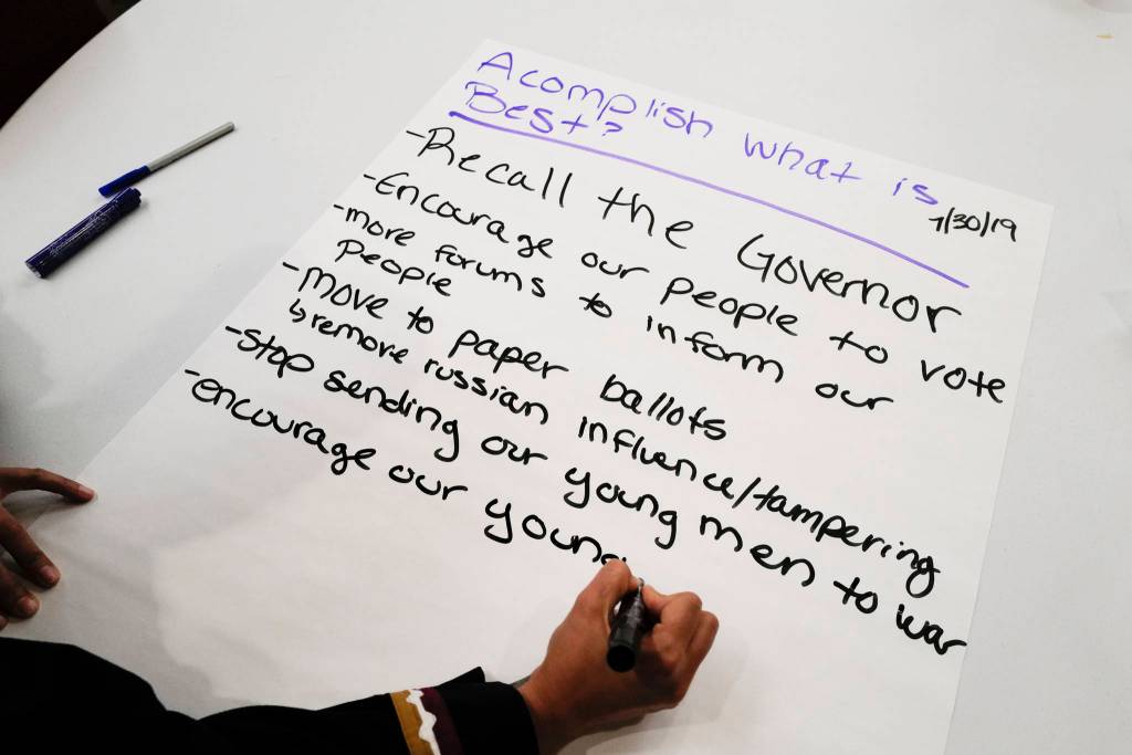 Participants in the forums discussed issues with tablemates and Alaska Native elders present, identifying issues they perceived to be present within the state and ways to solve them. A proposed solution shouted to the hall, ‘Recall Dunleavy,’ was met with applause.