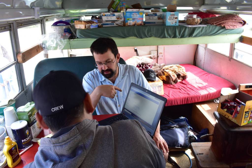 IBU representative Earling Walli, center, helps union members sign up online for the ratification vote inside a converted school bus at the Auke Bay ferry terminal on Friday, August 2, 2019 (Peter Segall | Juneau Empire)