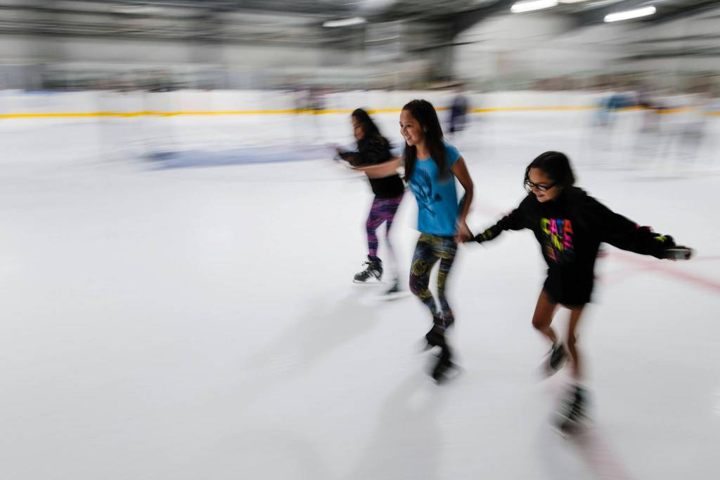 Christianna Lott, 12, left, Lashya Bagoyo, 12, center, and Malaya Willard, 10, hold hands as they skate during a free skate on the opening day at the Treadwell Arena on Monday, Aug. 5, 2019. (Michael Penn | Juneau Empire)