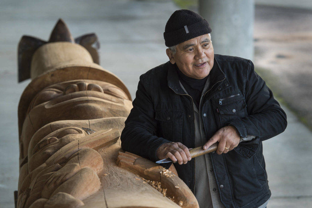 Wayne Price, master Tlingit carver and Associate Professor of Northwest Coast Arts and Sciences, works on a healing pole at the University of Alaska Southeast on Wednesday, Oct. 31, 2018. (Michael Penn | Juneau Empire File)