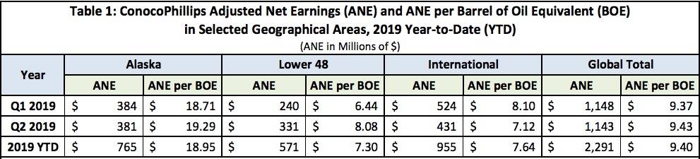 In a July 31 report from Legislative Research Services, ConocoPhillips’ earnings per barrel in Alaska were more than double earning from production in the Lower 48 for 2019 so far.
