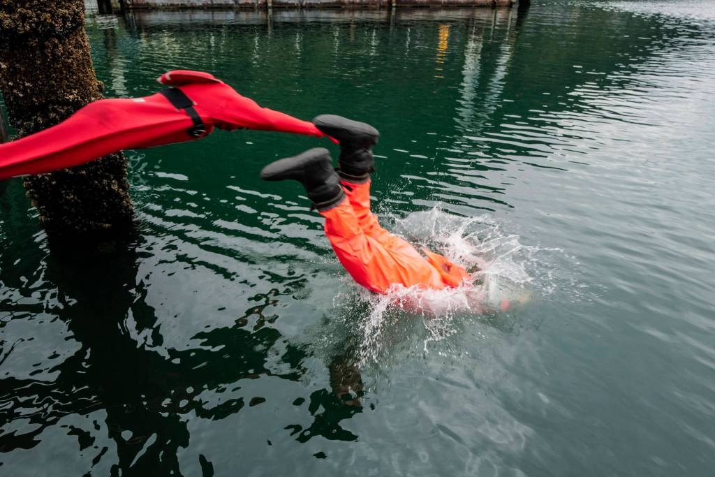 Games included a survival suit relay swim in the harbor, to and from a boat 25 meters from the pier.