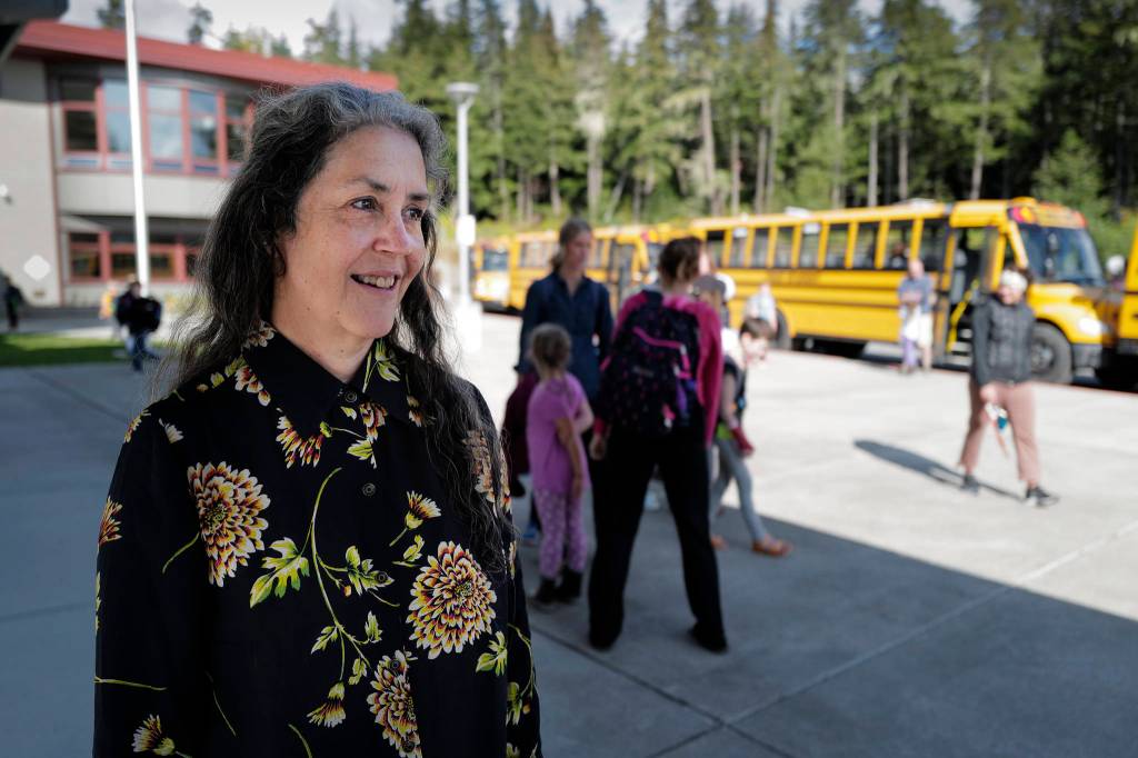 Pam Garcia, a long-time educator at Auke Bay Elementary School, watches as students catch their buses after school on Tuesday, Sept. 3, 2019. Garcia was named as one of three finalist for Alaska Teacher of the Year. (Michael Penn | Juneau Empire)