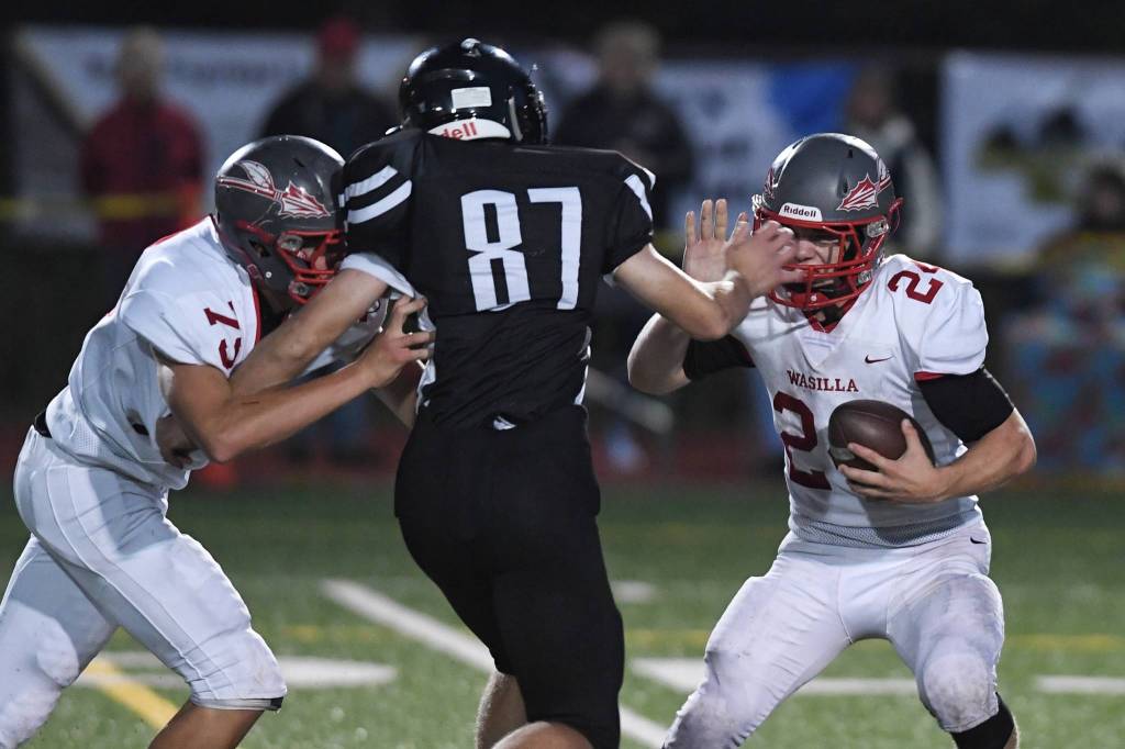 Juneau’s Cole Jensen, center, moves in to sack Wasilla’s quarterback Colton Lindquist, right, despite blocking by Wasilla’s Andrew Devine in the second quarter at Adair-Kennedy Memorial Field on Friday, Sept. 6, 2019. (Michael Penn | Juneau Empire)