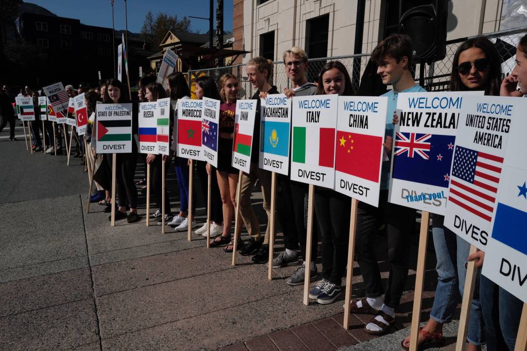 Local students are holding signs welcoming members of the International Forum of Sovereign Wealth Fund and urging them to divest from fossil fuels.