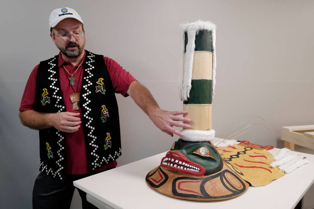 Eric Hollinger, Tribal Liaison for the Repatriation Office of the Smithsonian’s National Museum of Natural History, talks about a sculpin clan hat replica before a welcoming ceremony at Elizabeth Peratrovich Hall on Wednesday, Sept. 25, 2019. The original hat was collected from the Kiks.ádi Clan in Sitka in 1884. The Smithsonian Institution used a 3D digitization process to document the hat and construct the hat using traditional materials. (Michael Penn | Juneau Empire)
