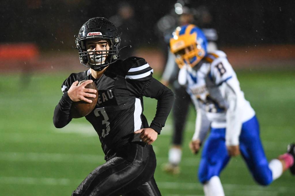 Juneau’s Huskies Football team competes against Bartlett High School at Adair-Kennedy Memorial Field on Saturday, Oct. 5, 2019. Brushing off rain and wind, Juneau wins 67-24. Read more about the game here: Tilt against Bartlett won’t be the Huskies last home game