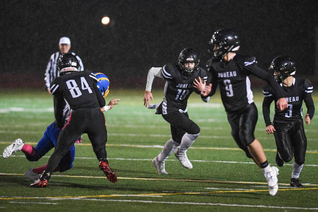 Juneau’s Cooper Kriegmont, center, follows blocking by teammates Dawson Hickok, left, Wallace Adams and Gaby Soto, right, against Bartlett at Adair-Kennedy Memorial Field on Saturday, Oct. 5, 2019. Juneau won 67-24. (Michael Penn | Juneau Empire)