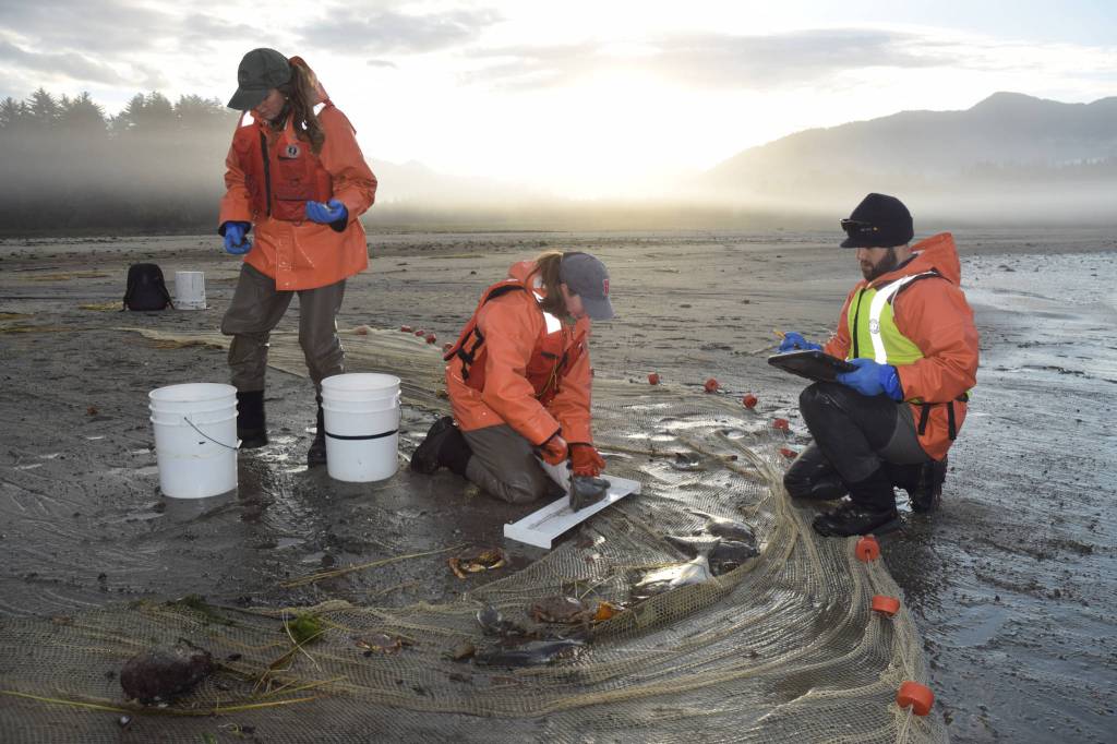 UAS and UAF researchers Nina Lundstrom, left, Anne Beadreau, middle, and Doug Duncan sort through marine life caught in a beach seine on August 2017, near Fish Creek. (Kevin Gullufsen | Juneau Empire File)