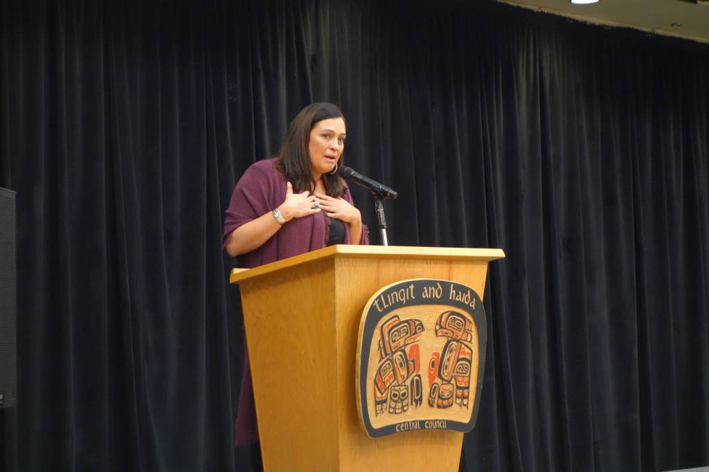 With welcoming remarks wrapped up, Patricia Alexander, co-chair for the Tlingit & Haida Violence Against Women Task Force, is the day’s first featured speaker.