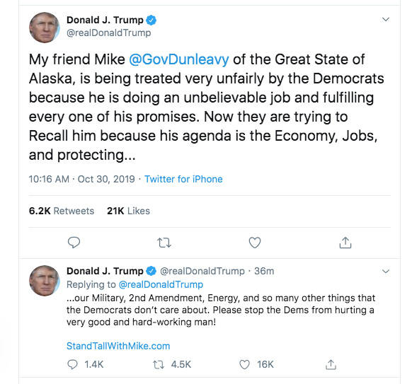 At the end of his second tweet in support of the governor, Trump included a link to the Stand Tall with Mike campaign, a fundraising site to combat the Recall Dunleavy campaign.