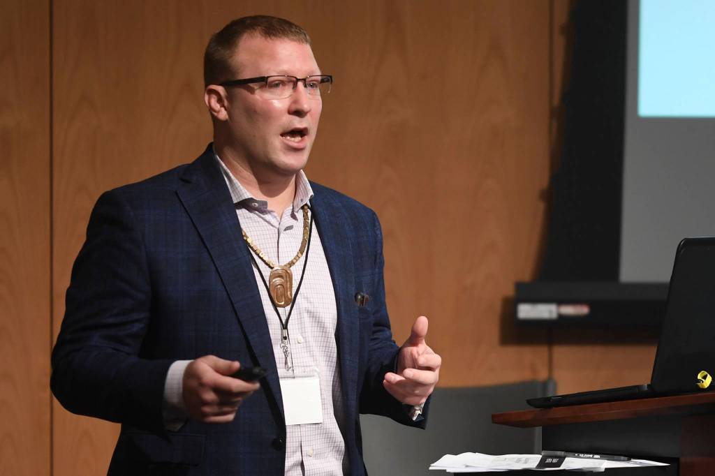 Lee Kadinger, Chief of Operations for Sealaska Heritage Institute, speaks about sustainable use of sea otter pelts at the Southeast Sea Otter Stakeholder meeting at the Andrew P. Kashevaroff Building on Wednesday, Nov. 6, 2019. (Michael Penn | Juneau Empire)