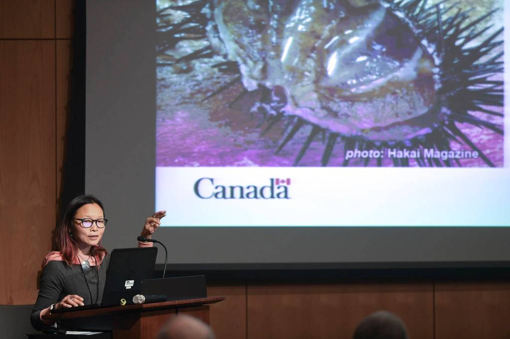 Lynn Lee with the Gwaii Haanas National Park Reserve in British Columbia speaks about the restoration of sea kelp beds at the Southeast Sea Otter Stakeholder meeting at the Andrew P. Kashevaroff Building on Wednesday, Nov. 6, 2019. (Michael Penn | Juneau Empire)