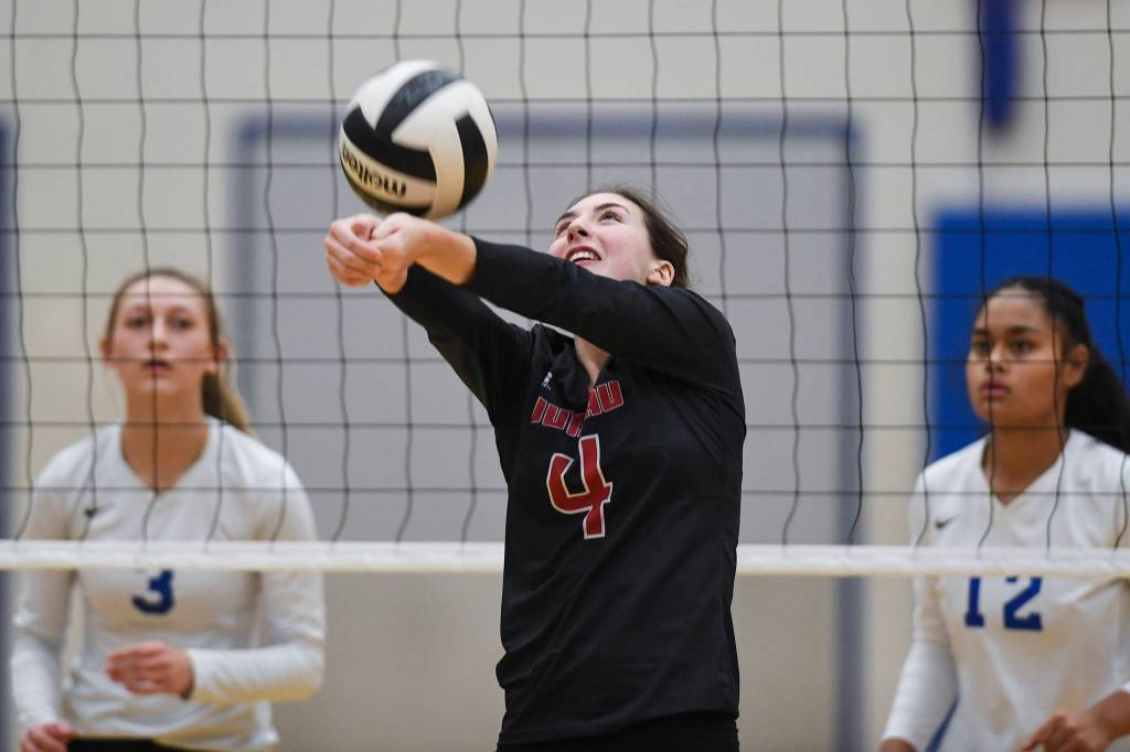 Juneau-Douglas’ Jenae Pusich bumps the ball up against Thunder Mountain during the Region V Volleyball Tournament at Thunder Mountain High School on Friday, Nov. 8, 2019. JDHS won 25-22, 26-24, 25-20. (Michael Penn | Juneau Empire)