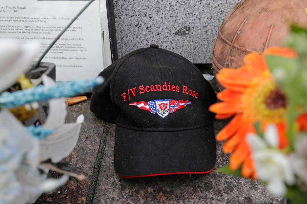 A ball cap with the name of the crab fishing boat Scandies Rose rests at the Seattle Fishermen’s Memorial, Thursday, Jan. 2, 2020, in Seattle. (AP Photo | Ted S. Warren)