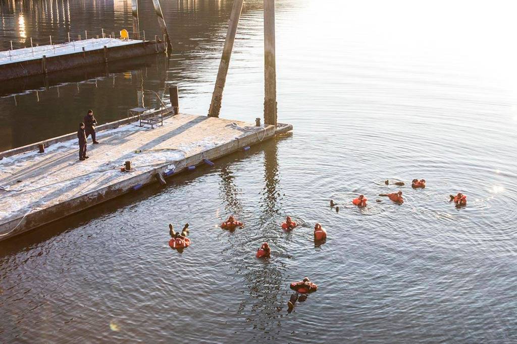 Ten Coast Guardsmen jumped into 32-degree waters in survival suits, fulfilling both an annual requirement to be up to speed on flotation technique and the need to check the integrity of the suits themselves. The air temperature at the pier was roughly 18 degrees, not factoring for wind chill, according the National Weather Service.