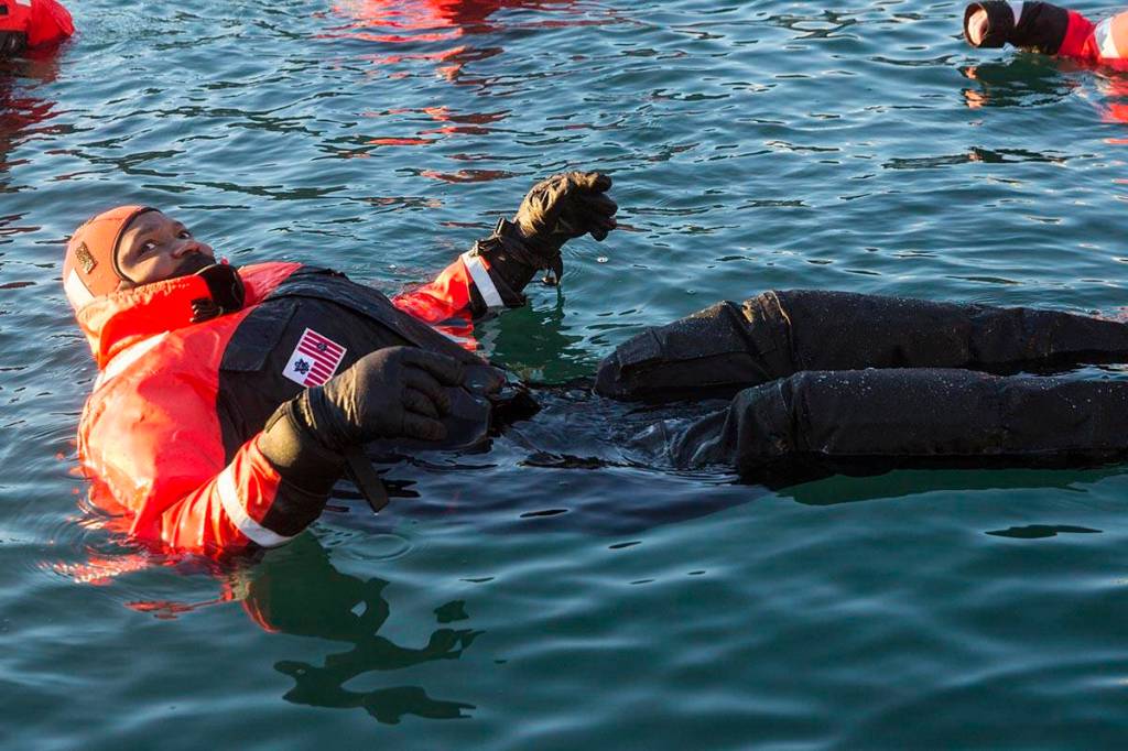 The suits are used by Coast Guardsmen on the water every time the temperature goes below 50 degrees, Williams said. In warmer temperatures, what’s called a mustang suit might be used, which is less cumbersome. Above a certain temperature, only a life jacket is required.