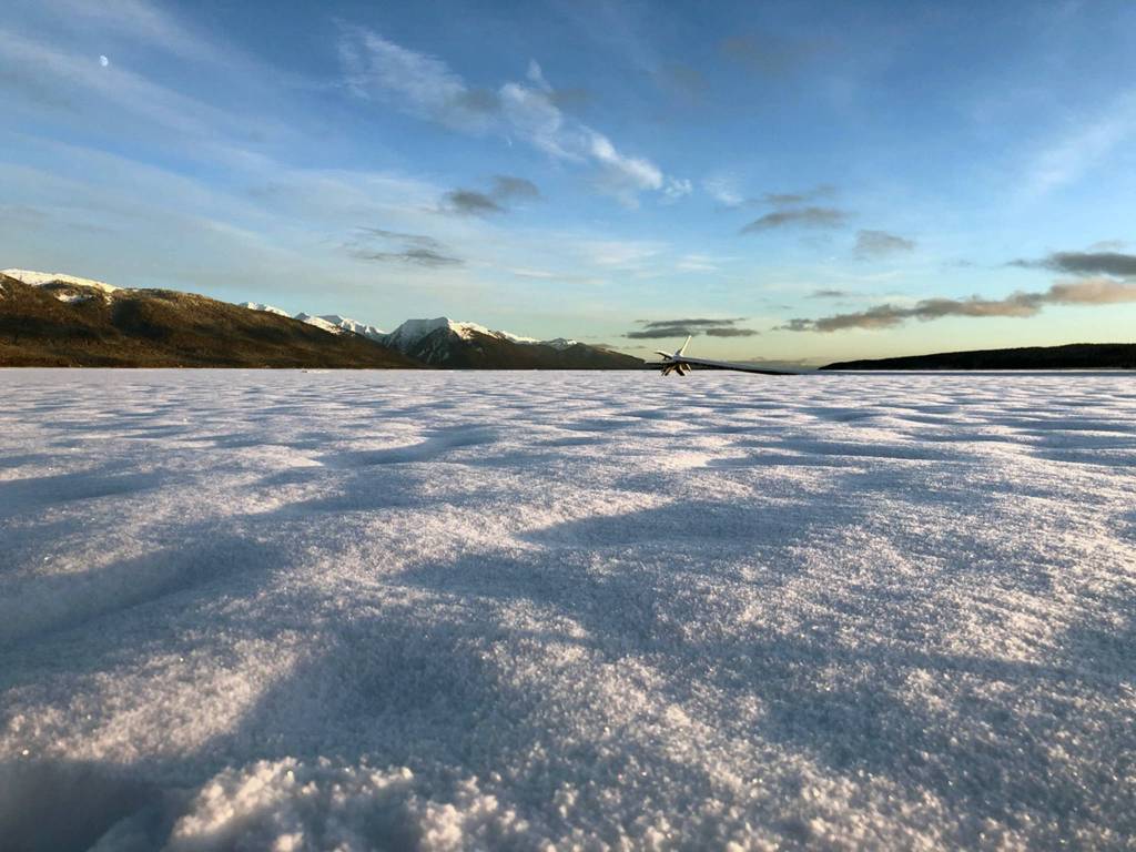 At the edge of the estuary, an otter had emerged and left a typical trail of footprints interrupted by a long, smooth slide. A raven had hopped up from the water’s edge and gone airborne, leaving the marks of jumping feet and just one wing. Perhaps it veered off to the side as it took off. A very small shorebird had left its prints in the mud. The snow on the high intertidal area was smooth and unmarked; no wolves or moose had passed by there recently.