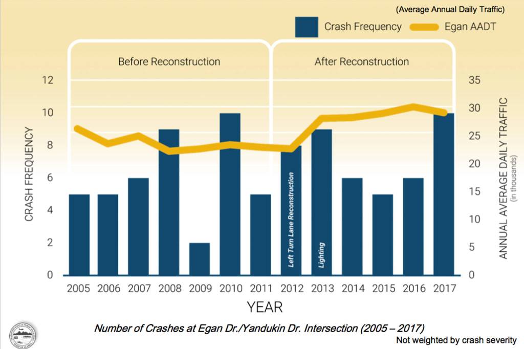 During Goins’ and Brown’s presentation, they provided statistics from a 2013 study — Brown said DOT is working to update the figures — that found the Fred Meyer intersection saw the eighth most crashes in Juneau.