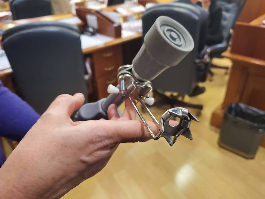 Rep. Laddie Shaw, R-Anchorage, and Rep. Harriet Drummond, D-Anchorage, each had some hardware. One of Shaw’s arms was in a sling, and Drummond made her way around the House floor with a pair of crutches.
