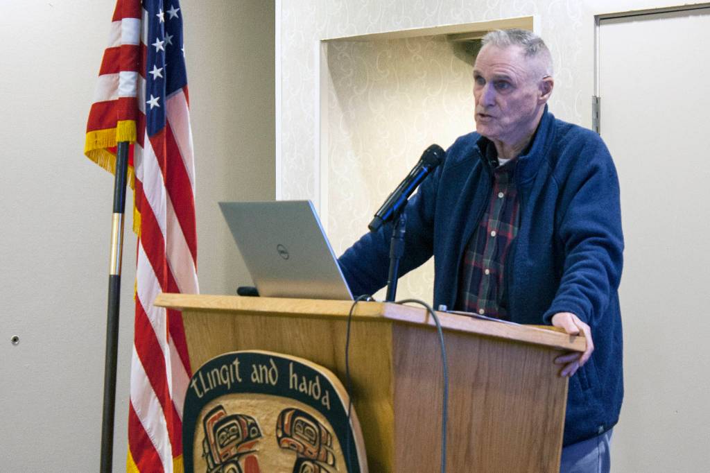 Bill Corbus, former revenue commissioner and past president of Alaska Electric Light and Power Company speaks Thursday at a Greater Juneau Chamber of Commerce meeting at Elizabeth Peratrovich Hall. (Ben Hohenstatt | Juneau Empire)
