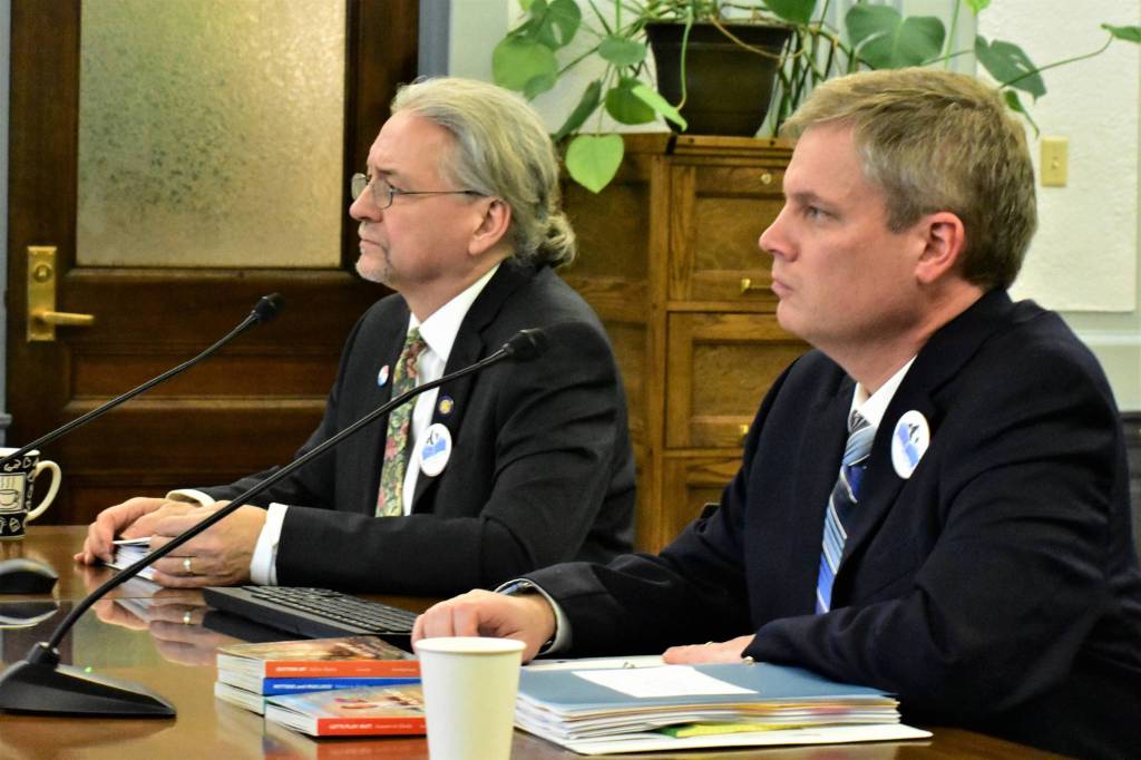 Sen. Tom Begich, D-Anchorage, left, and Education Commissioner Michael Johnson answer questions about the Alaska Reads Act at a Senate Education Committee meeting on Thursday. (Peter Segall | Juneau Empire)