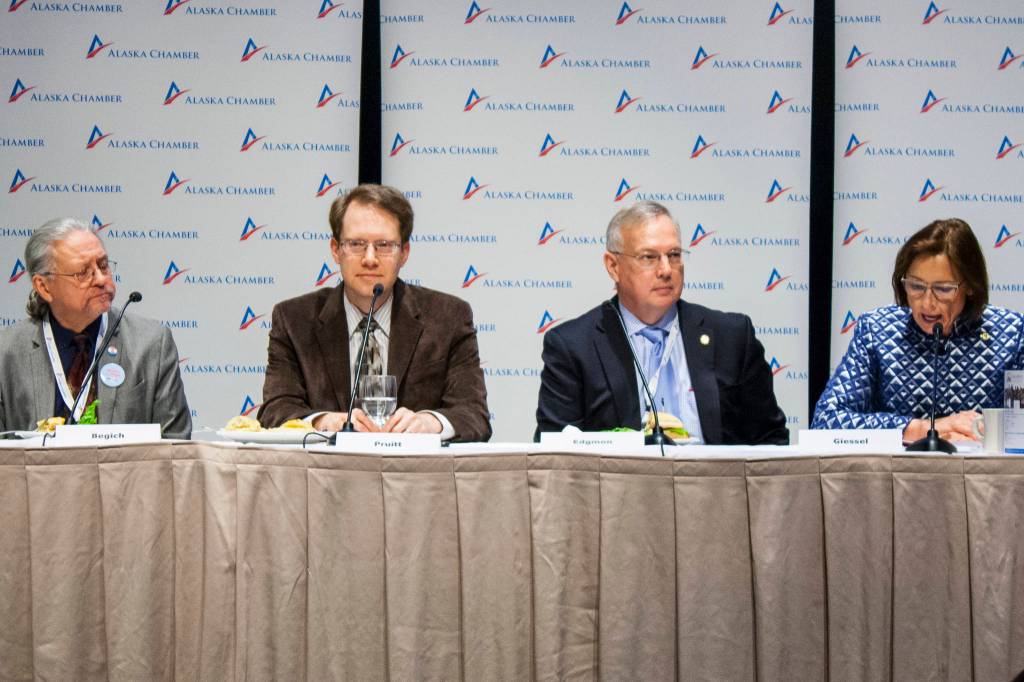 Senate President Cathy Giessel, R-Anchorage, Speaker of the House Bryce Edgmon, I-Dillingham, House Minority Leader Lance Pruitt, R-Anchorage, and Senate Minority Leader Tom Begich, D-Anchorage, told attendees at the Alaska Chamber’s Legislative Fly-In that they want this session to end on time and lawmakers are working together.