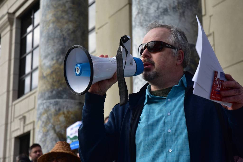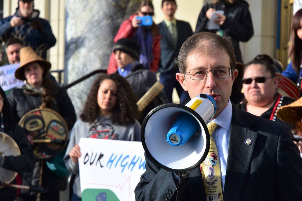 Sen. Jesse Kiehl, D-Juneau, speaks to the crowd at a rally to support of the Alaska Marine Highway System on Tuesday, Feb. 11, 2020. (Peter Segall | Juneau Empire)