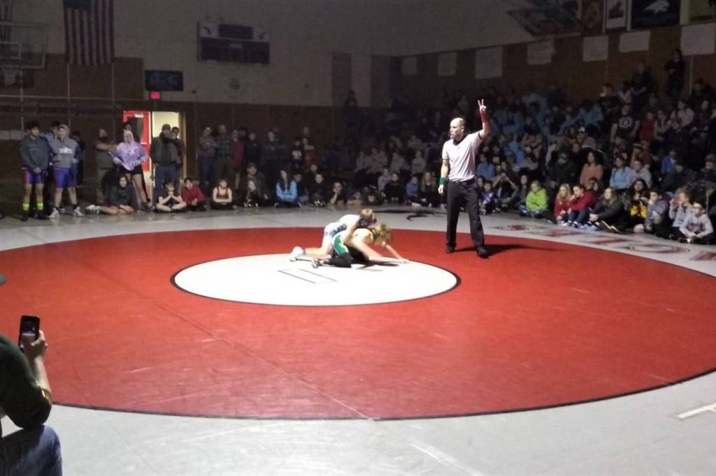 During the final matches of the tournament, lights are turned down in the gym at Floyd Dryden Middle School for the Southeast Alaska Middle School Wrestling Tournament on Saturday, Feb. 15, 2020. (Courtesy photo | Ken Brown)