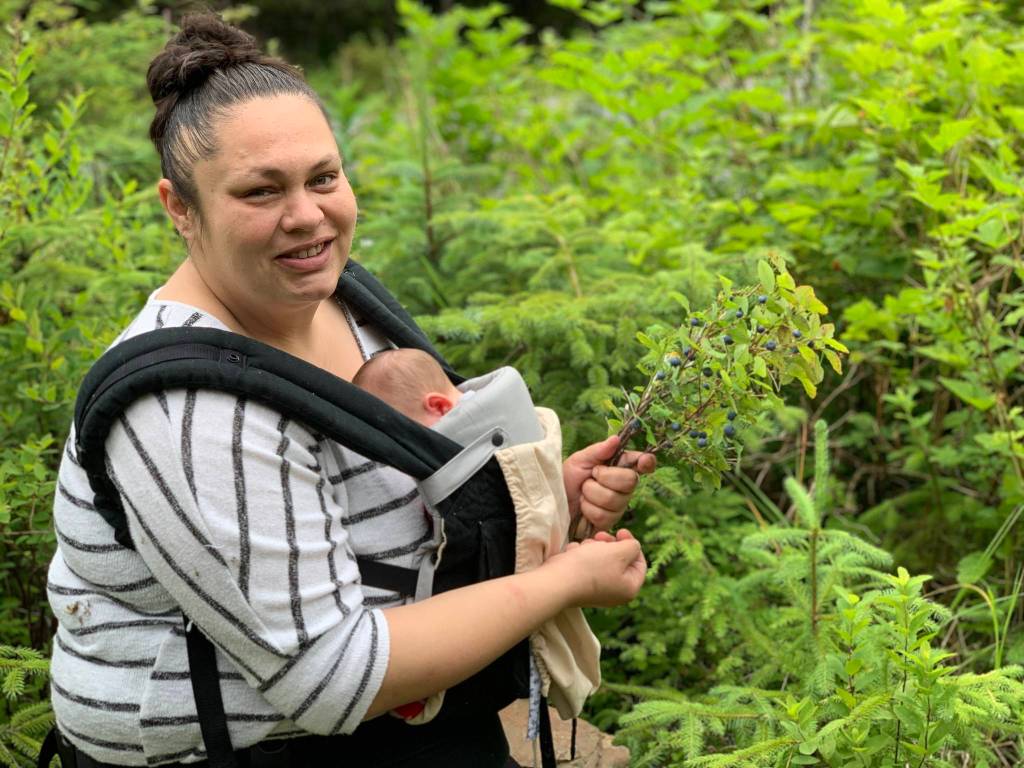 I’m standing next to my daughter Nikka and my newborn grandson, “Bear.” Bear is in a carrier strapped to Nikka’s chest and she’s picking blueberries along with us. This is Bear’s first outing into the wilderness and he’s only two weeks old.