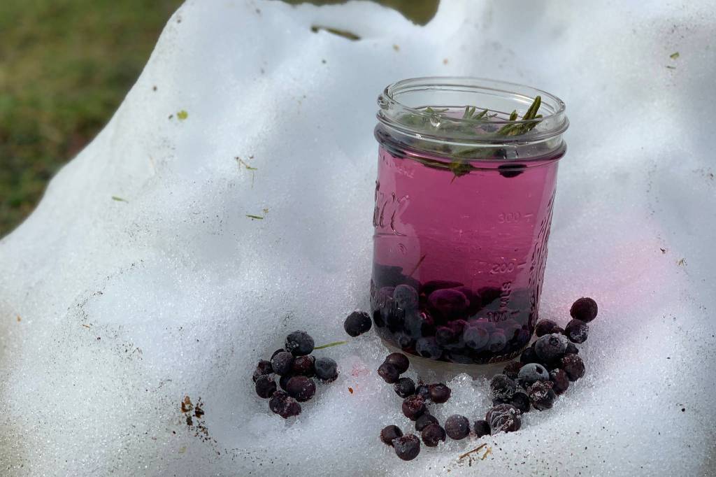 I put a handful of blueberries into a mason jar filled with water and add a few sprigs of spring-growth Labrador tea, and for good measure, I add several spruce tips and let the water steep for a few minutes.
