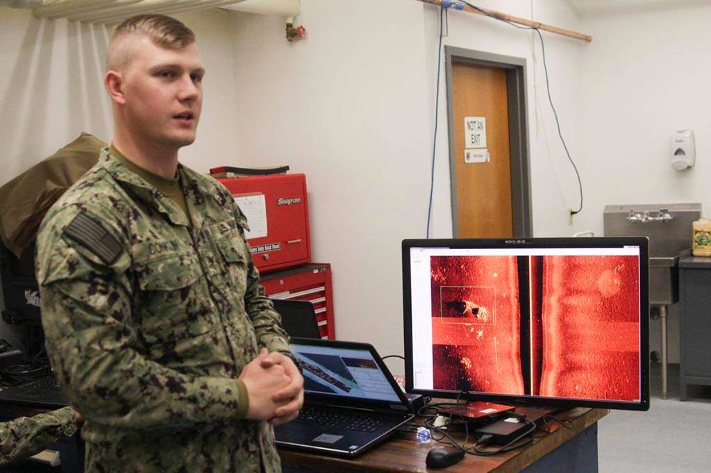 Navy Petty Officer 2nd Class Derek Conklin, an unmanned underwater vehicle operator, shows the imagery of Juneau’s seafloor scanned with the UUV’s sonar at Coast Guard Station Juneau on Saturday.
