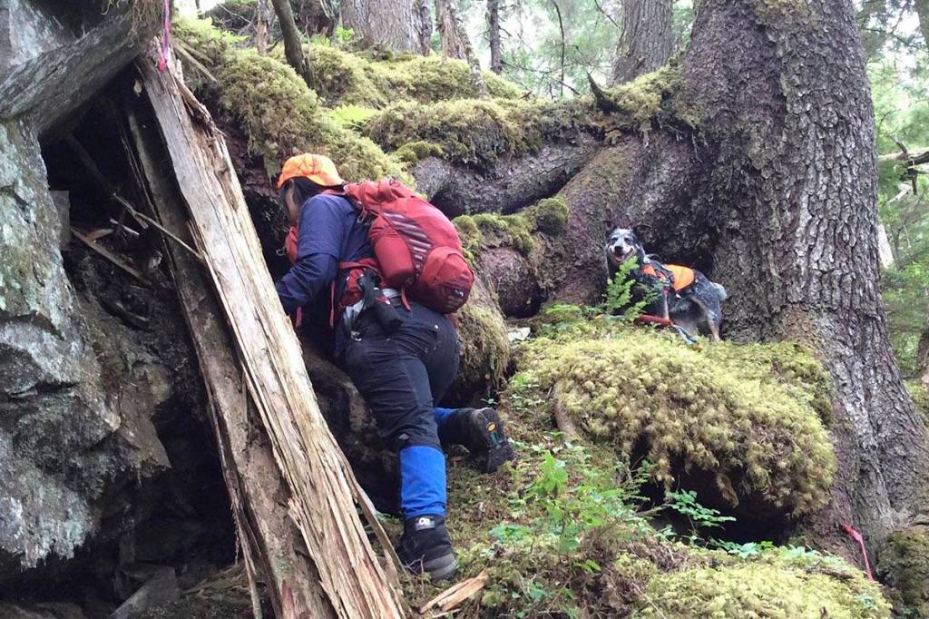Jack was trained using a variety of stimuli, including guano, scent swabs, live bat fur and dead bats. Jack and his handler, Collette Yee, helped Rhoads and others locate hibernacula along the Mansfield Peninsula ridge on Admiralty Island and in the ridges near Fish Creek in north Douglas.