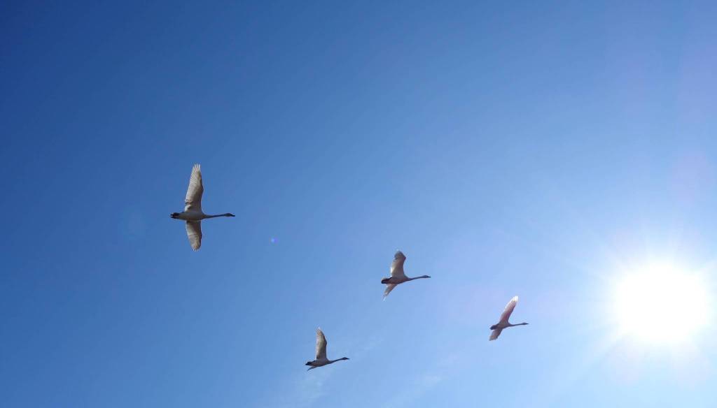 The trumpeter swans, the final birds to leave the state last fall, were perhaps recently fattening up in farmer’s fields of Saskatchewan. Scientists who tracked tundra swans once found that two groups of birds leaving Alaska — some wintering on the East Coast of the U.S. and some on the West Coast — both touched down in Saskatchewan before continuing their migrations.
