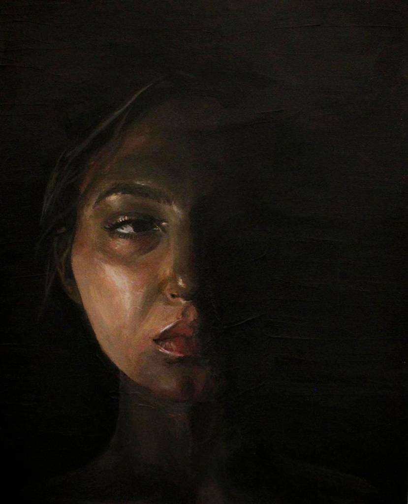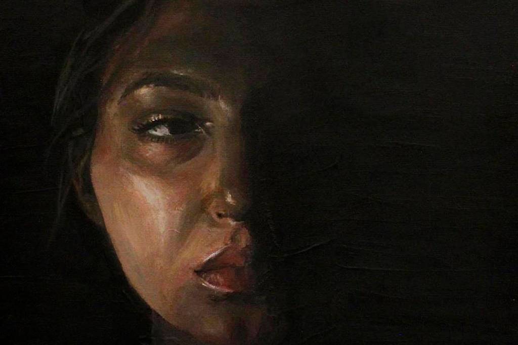 The painting depicts a feminine face partially obscured by shadow.