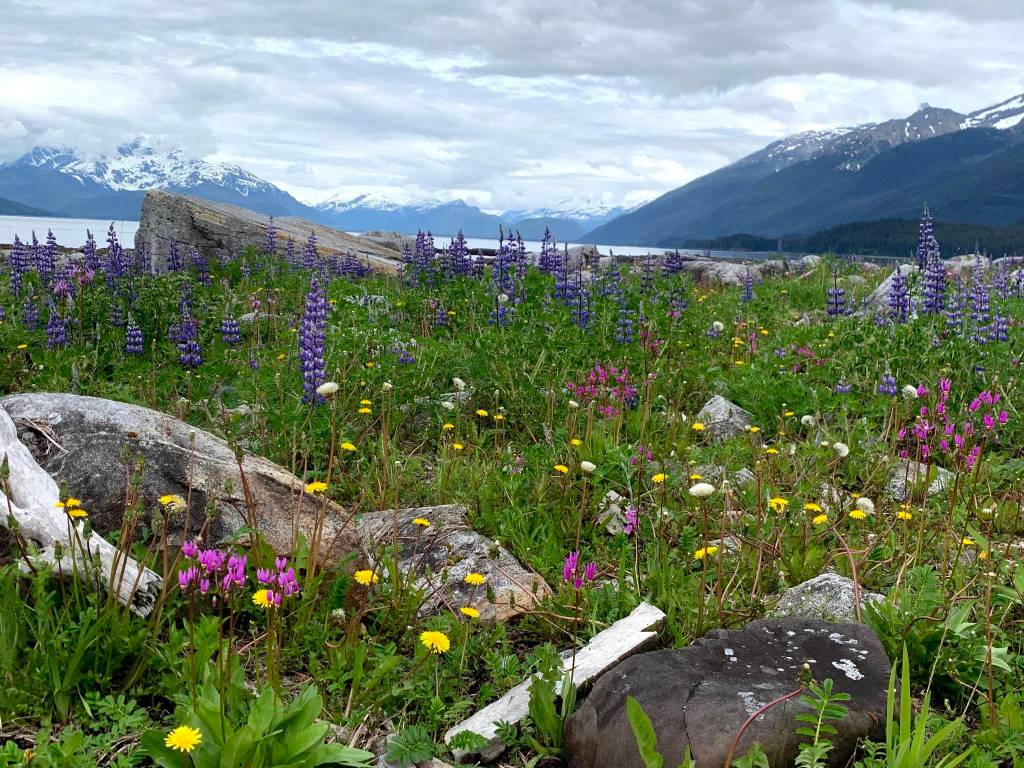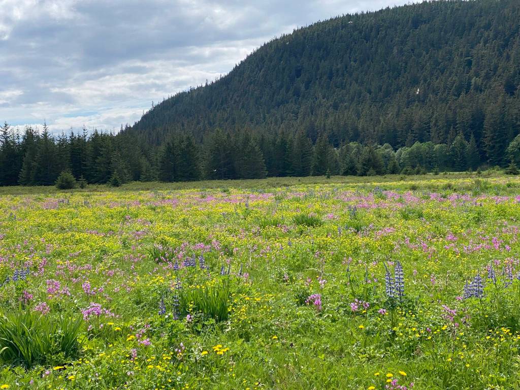 However, on the last weekend in May, a bunch of regular Saturday hikers went out to Cowee Meadows. On the way down the trail, we enjoyed the many bog laurels and bog rosemary flowers in the muskeg, and we stopped to inspect the young bracken ferns for nectaries. Cowee Meadows is a place I like to visit several times as spring becomes summer, to see the seasonal development of the flower show. A couple of weeks ago, there were a few shooting stars, some buttercups and marsh marigolds, but little else. But now, the meadows were awash in color: lots of yellow buttercups, shooting stars in all shades of pink, joined now by tall blue lupines. Hidden under the taller plants were violets, starflowers, and the coming chocolate lilies. Even without the famous irises and the banks of roses, which will bloom in a week or two, this is a spectacular sigh — hard to beat! Carpets of strawberry flowers out near the river weren’t bad, either, even though I never get there in time to harvest any of the fruits. Nostalgic feelings were successfully subdued.