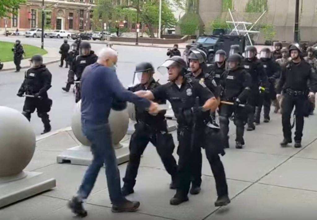 But let’s imagine that the stress of all the protests caused a few officers to literally push back. That doesn’t explain the false statement issued by the Buffalo Police Department shortly afterwards. It claimed that during a “skirmish involving protesters, one person was injured when he tripped & fell.”