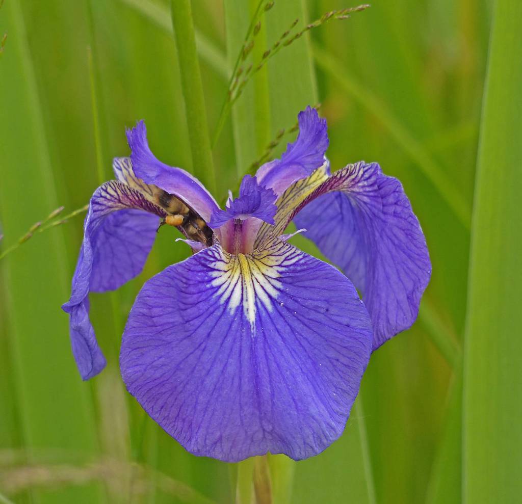 Few bees were flying on this day, but they are probably the principal pollinators of iris, as well as visiting many other flowers. A small insect might enter the flower but would not be big enough to contact the sexual parts. A bee crawls into the iris flower over a drooping petal-like sepal (the true petals are smaller and upright), passing under a narrow arm that bears the stigmatic surface where pollen is received, and then under a rod-shaped, pollen-producing stamen on its way to the nectar deep inside the flower. Cross-pollination would happen if the bee visited more than one flower, but the flowers are reported to be self-compatible, so if a bee happens to pick up some pollen on its way out of the flower and deposit some on the stigmatic surface, a seed might be produced that way.