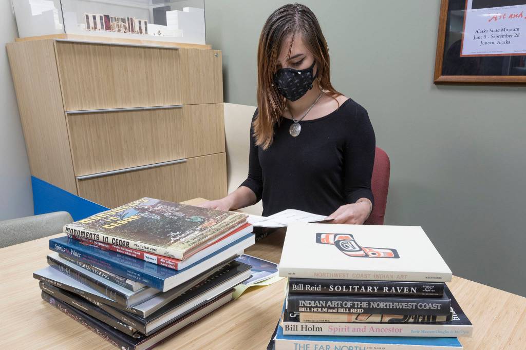 Sealaska Heritage Institute media intern and Northwest Coast art student Mikayla Mitchell peruses some of the books recently donated to the institute by Lesley Jacobs. (Courtesy Photo | Brian Wallace for Sealaska Heritage Institute)