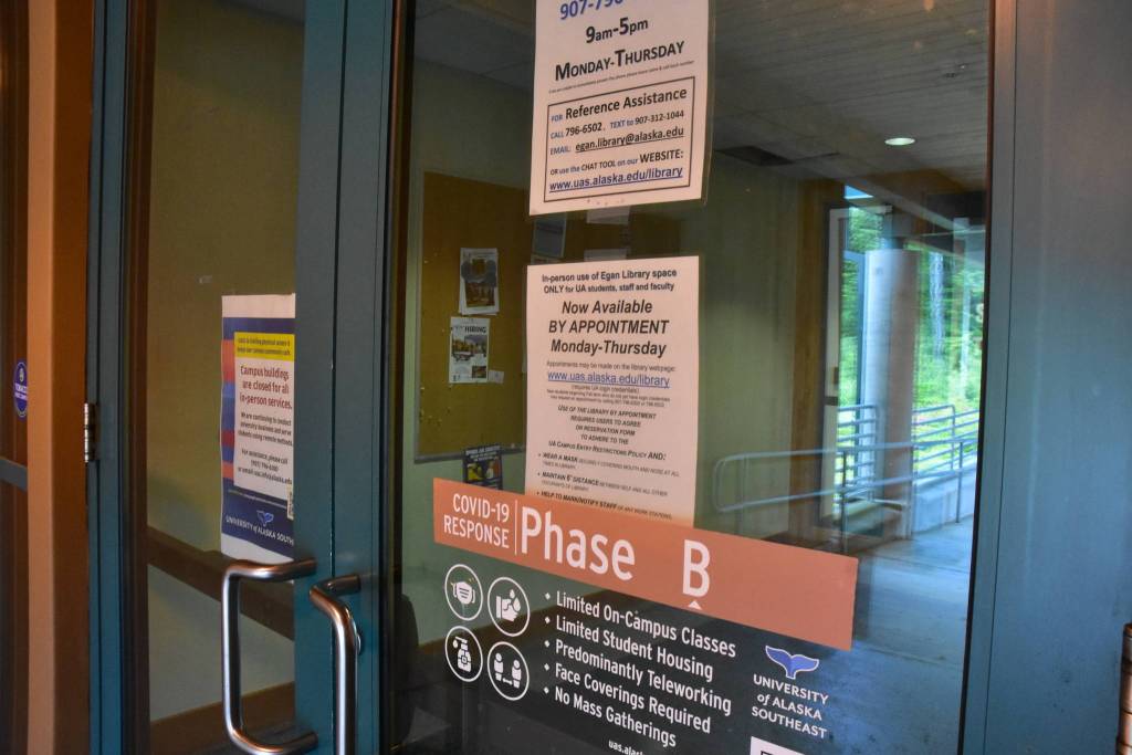 Doors on the University of Alaska Southeast Juneau campus are locked and normally public facilities are reserved for university personnel only on Wednesday, Aug. 5, 2020. The UA Board of Regents voted to rescind a controversial proposal to merge UAS with UA Fairbanks at their meeting Wednesday, but that doesn’t mean big changes are off the table. (Peter Segall | Juneau Empire)